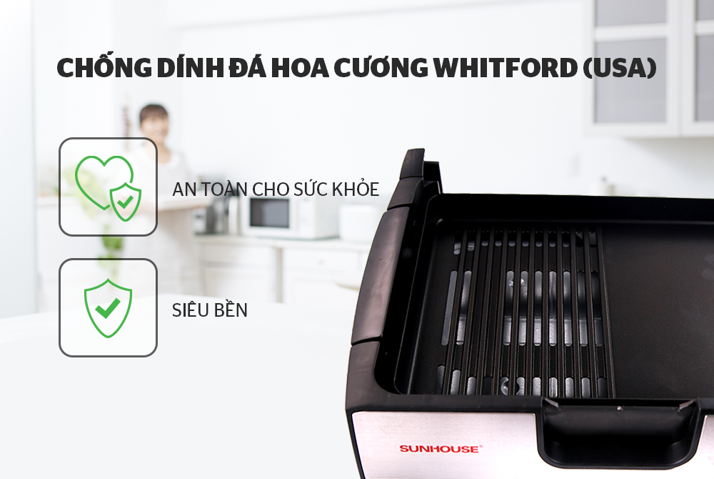 Mặt bếp được phủ lớp chống dính đá hoa cương Whitford (USA) siêu bền, kháng khuẩn, không chứa hóa chất gây hại và không thôi nhiễm vào thực phẩm trong quá trình nấu. Lớp chống dính giúp hạn chế bám dính dầu mỡ, việc vệ sinh trở nên nhanh chóng và đơn giản hơn.