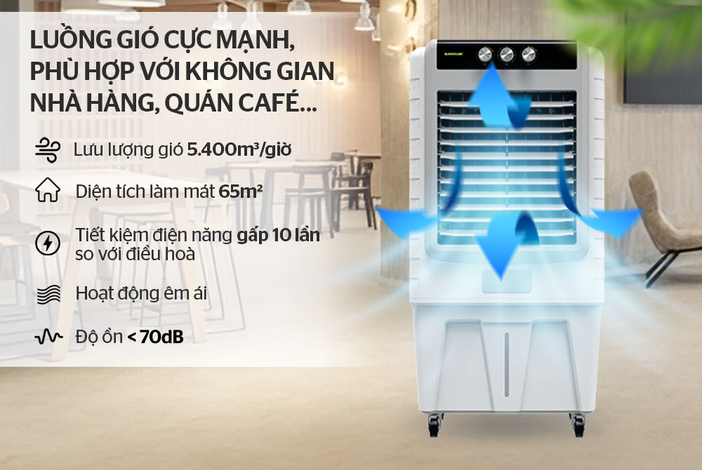 Nhờ lưu lượng gió lớn lên tới 5.400 m³/giờ kết hợp chức năng đảo gió tự động trái – phải, thiết bị có thể mở rộng phạm vi làm mát lên đến 65m², phù hợp cho nhà hàng, quán ăn, quán cafe hoặc các khu vực đông người.
