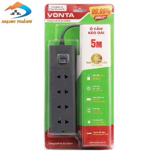 Ổ cắm kéo dài 2 chấu VONTA có thiết kế hiện đại, cấu trúc chắc chắn và khả năng chịu tải, chịu nhiệt tốt. Sản phẩm phù hợp cho nhu cầu cấp nguồn linh hoạt trong gia đình và văn phòng.