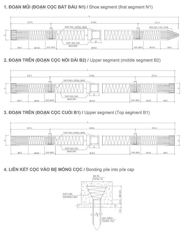 Cọc vuông DƯL 250x250mm được thiết kế theo bản vẽ điển hình, đáp ứng đầy đủ các yêu cầu kỹ thuật và tiêu chuẩn hiện hành.