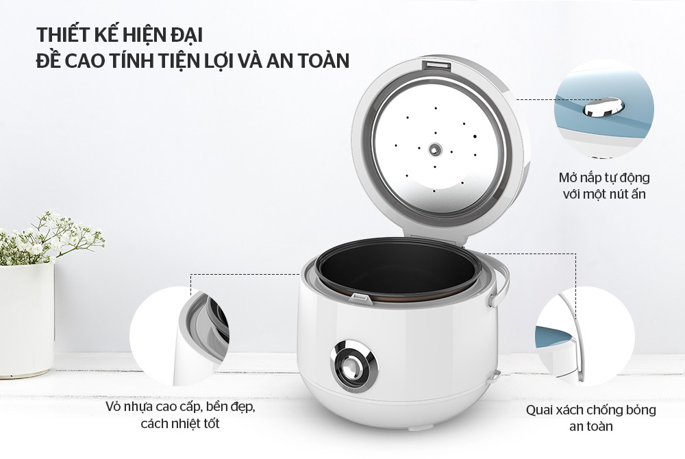 Thân nồi được làm từ nhựa cao cấp chịu nhiệt – chịu lực tốt, hạn chế trầy xước và dễ vệ sinh. Đi kèm là quai xách chống bỏng chắc chắn, giúp di chuyển nồi an toàn ngay cả khi vừa nấu xong.
